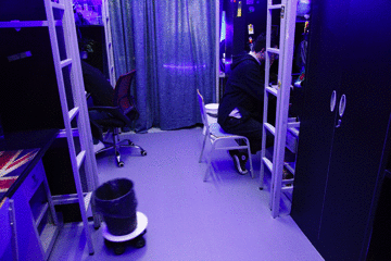 鄧亞東告訴北青報記者,這個創(chuàng)意來自于《星球大戰(zhàn)》,電影中藍光的特效讓他“有一種身居宇宙的感覺”,于是他們把屋子的上游部分裝上了LED燈帶,打開開關時,也能泛起藍光。為了更好地襯托“這道藍光”,他們又在墻壁上貼了黑色環(huán)保壁紙,在地上鋪了灰色反光材料的地膠,“讓藍光從天花板到地面再到墻壁遙相呼應”。這樣的設計讓他們的宿舍生活充滿了情調,“就好像把宿舍搬到了宇宙中”。