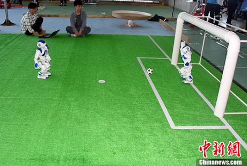 資料圖:2018年3月29日,廈門大學(xué)大學(xué)生創(chuàng)新創(chuàng)業(yè)實(shí)踐基地,大學(xué)生團(tuán)隊(duì)演示他們研發(fā)出的機(jī)器人足球。 中新社記者 孫自法 攝