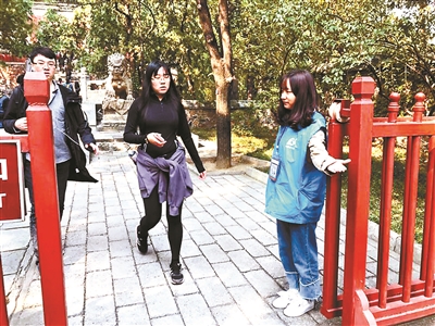 大學(xué)生志愿者在香山公園疏導(dǎo)游客,維護游園秩序供圖/香山公園管理處