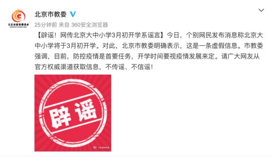 人民網(wǎng)北京2月19日電(李依環(huán))據(jù)北京市教育委員會(huì)官方微博消息,今日,個(gè)別網(wǎng)民發(fā)布消息稱(chēng)北京大中小學(xué)將于3月初開(kāi)學(xué)。對(duì)此,北京市教委明確表示,這是一條虛假信息。北京市教委強(qiáng)調(diào),目前,防控疫情是首要任務(wù),開(kāi)學(xué)時(shí)間要視疫情發(fā)展來(lái)定。請(qǐng)廣大網(wǎng)友從官方權(quán)威渠道獲取信息,不傳謠、不信謠。