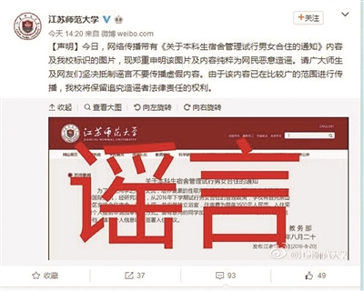 8月20日上午,一條截圖在微信朋友圈迅速傳開(kāi)。截圖顯示是江蘇師范大學(xué)官網(wǎng)發(fā)布的一條通知,通知稱校方共2016年第二學(xué)期開(kāi)始,可以申請(qǐng)男女合住。由于該內(nèi)容已在比較廣的范圍進(jìn)行傳播,我校將保留追究造謠者法律責(zé)任的權(quán)利。