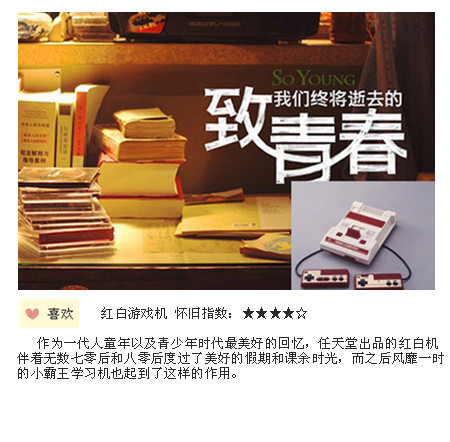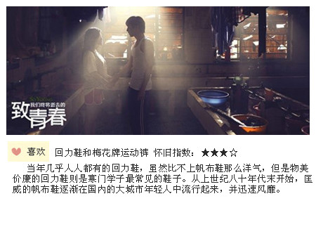 趙薇首次執(zhí)掌導演的電影《致我們終將逝去的青春》公映后票房不菲,該影片據(jù)同名網(wǎng)絡小說 改編,背景放在九十年代的大學校園,為了契合時代背景,主創(chuàng)團隊精心挑選了獨屬于當時的特定物 件向那個時代致敬:上下鋪的宿舍、隨處可見的硫化帆布鞋、時髦發(fā)型,紅白游戲機、BP機以及片中 的插曲等都充滿了濃濃的懷舊氛圍。【詳情】...