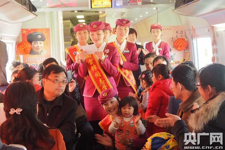 2015年3月5日北京鐵路局在G13次北京南—上海虹橋的旅客列車上開展《弘揚雷鋒精神 共建文明家園》主題活動。圖為:乘務(wù)員與旅客同唱雷鋒歌曲。(央廣網(wǎng)記者何微攝)