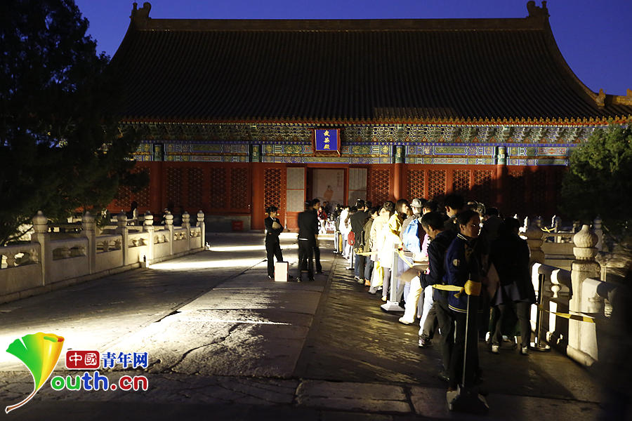 10月11日,故宮武英殿外,觀眾在夜幕中排隊等候參觀《石渠寶笈》特展,此時他們至少已經(jīng)等待超過十個小時。