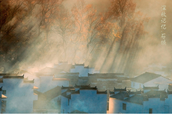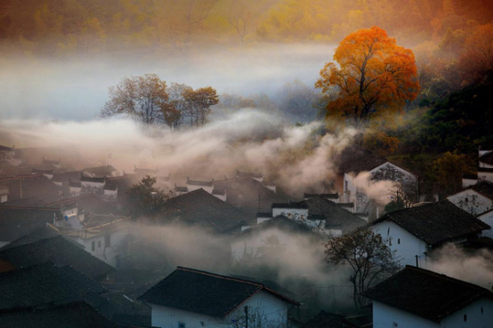 石城,最佳視覺時間:(早晨)5:30–9:30分。在這里數十棵百年紅楓與白墻黑瓦的徽式古村落,百姓日出而作、日落而息的淳樸生活,清晨的裊裊炊煙、山間繚繞的云霧、鋪滿紅葉的古驛道相互融合;山水相映,色彩配合,晨昏變化,動靜相襯體現(xiàn)得淋漓盡致,構成一幅幅怡神悅性的絕世山水畫。