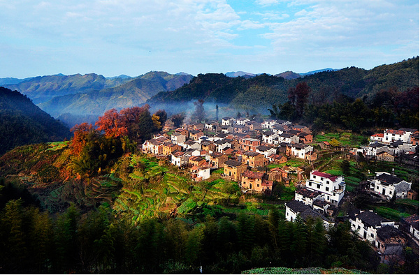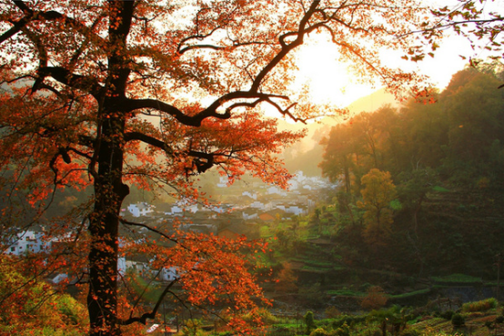 11月中旬至12月上旬,是欣賞婺源秋色的最佳時間。此時的婺源鄉(xiāng)村正值秋濃,那些遍布于村頭鄉(xiāng)間及山野溪邊的古木老樹紛紛開始變色換妝,一棵棵楓樹也突現(xiàn)出英雄紅色,恣意盡顯其風流于一時。古老的村落粉墻黛瓦,清澈的溪水小橋人家,秋后的田野阡陌縱橫,火紅的楓葉相映生輝。晨曦暮靄中,炊煙裊裊,雞鳴犬吠,此情此景就是婺源鄉(xiāng)村的秋天,也正是我們尋找中的理想意境。