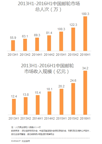 數(shù)據(jù)顯示,2016上半年中國(guó)在線(xiàn)郵輪市場(chǎng)總出游人次達(dá)94.1萬(wàn),同比增長(zhǎng)102.8%,總收入(交易額)18.6億元,同比增長(zhǎng)100%,占整個(gè)郵輪市場(chǎng)的54.4%,比去年同期提高了8個(gè)百分點(diǎn)。