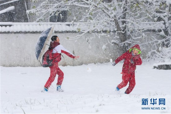 2月8日,在江蘇省淮安市盱眙縣淮河記事園,兩名孩子在雪中玩耍。受冷空氣影響,從2月7日起,全國多地陸續(xù)出現(xiàn)降雪天氣。 新華社發(fā)(周海軍 攝)