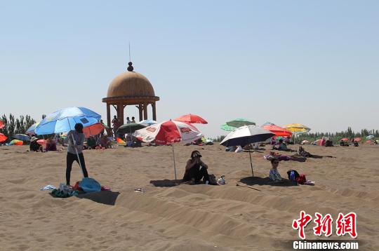 當(dāng)日,記者在吐魯番市維吾爾醫(yī)醫(yī)院沙療基地看到,數(shù)百名來自疆內(nèi)外的游客,有的人撐著遮陽傘、下半身埋在沙子里;有的人直接躺在沙丘上,用沙子將自己埋住,只露出臉部和胸口,然后再用毛巾蓋在臉上,享受著烈日的暴曬……