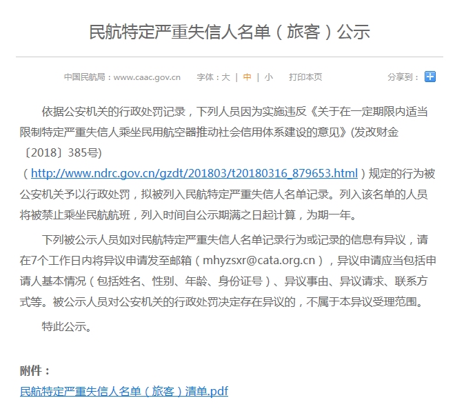 根據(jù)公告信息,列入該名單的人員將被禁止乘坐民航航班,列入時間自公示期滿之日起計算,為期一年。被公示人員如對民航特定嚴(yán)重失信人名單記錄行為或記錄的信息有異議,可在7個工作日內(nèi)提出異議申請。但被公示人員對公安機關(guān)的行政處罰決定存在異議的,不屬于本異議受理范圍。