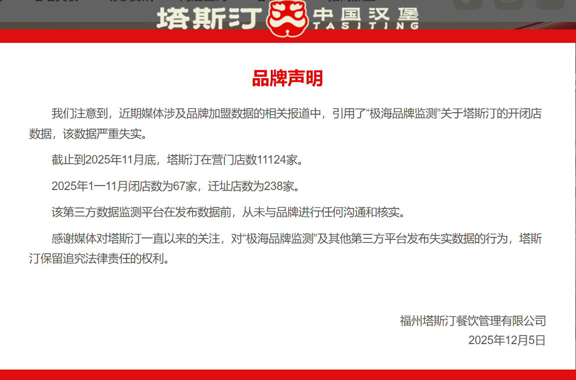 塔斯汀回應(yīng)“90天關(guān)了907家店”數(shù)據(jù)爭議:稱第三方監(jiān)測數(shù)據(jù)嚴(yán)重失實