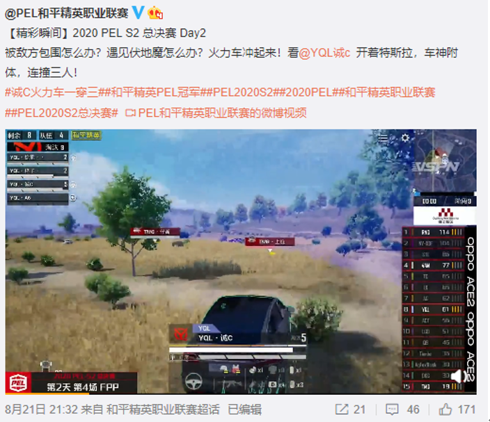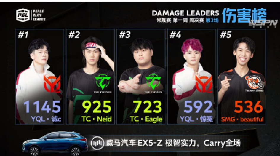 在首周的PEL 2020 S3 常規(guī)賽決賽中,YQL卻成功的浪起了一波又一波的高潮!簡直驚呆了觀戰(zhàn)的小伙伴們!憑借著主力選手誠c的強勢操作,YQL順利在前兩局比賽中吃雞,一舉登頂排行榜首位置。而誠c更是連續(xù)三局獲得MVP,成為PEL首次完成該成就的選手!
