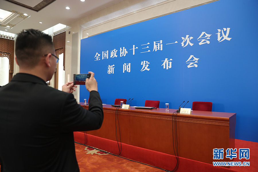 全國政協(xié)十三屆一次會議新聞發(fā)布會3月2日16:30在人民大會堂一層新聞發(fā)布廳召開,大會新聞發(fā)言人王國慶向中外媒體介紹本次大會有關情況并回答記者提問。圖為發(fā)布會前記者在現(xiàn)場拍攝。新華網(wǎng)/中國政府網(wǎng) 翟子赫攝
