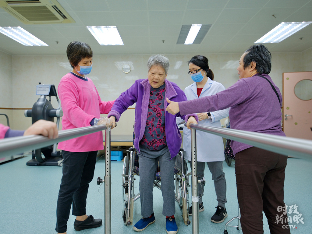 △澳門街坊總會頤駿中心成立于2007年,是一家專業(yè)的老年人服務機構。這是老人正在義工的幫助下做康復鍛煉。(央視記者彭柏閎拍攝)