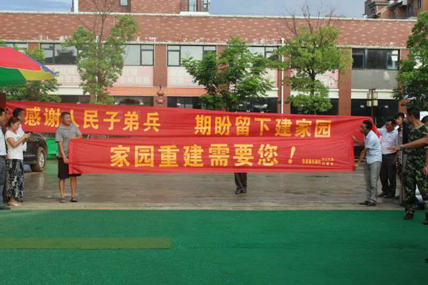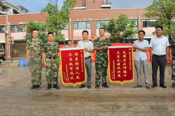 8月9日下午17時(shí)40分,在武警水電二支隊(duì)安徽東至縣搶險(xiǎn)臨時(shí)營(yíng)區(qū)門口,十幾名當(dāng)?shù)厥転?zāi)群眾拉起了“感謝人民子弟兵,期盼留下建家園”“家園重建需要您”等橫幅,送來(lái)了“情系張溪人民,盡顯鐵軍風(fēng)采”“危難關(guān)頭伸援手,大愛(ài)無(wú)疆戰(zhàn)洪魔”兩面錦旗,到部隊(duì)“請(qǐng)?jiān)浮,?qǐng)求官兵們留下來(lái),繼續(xù)幫助當(dāng)?shù)馗愫脼?zāi)后重建。