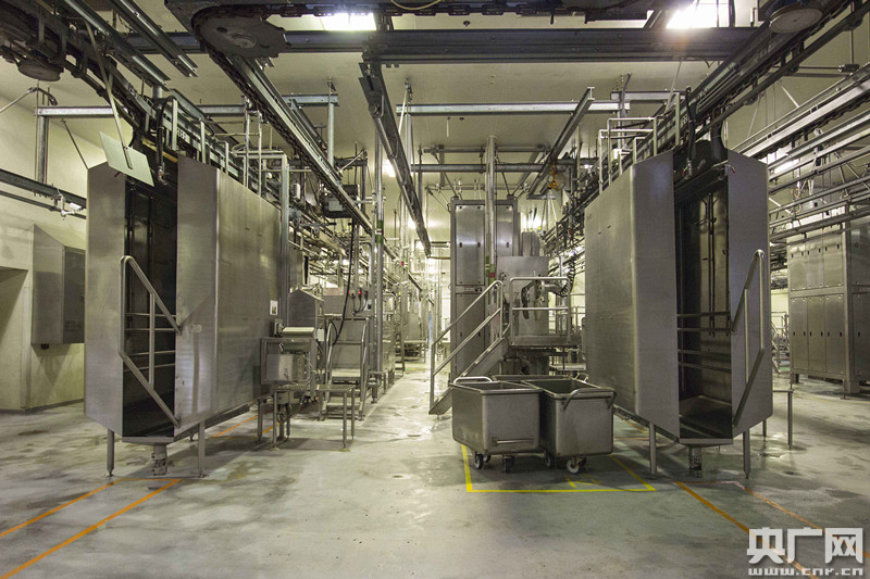 記者隨工作人員進入屠宰車間時,當日的屠宰工作剛完成不久,整個屠宰車間找不到一點殘留的肉制品痕跡,且?guī)缀趼劜坏缴蟮男瘸簟X撠熑烁嬖V記者,屠房內(nèi)設(shè)有獨立的生化污水處理系統(tǒng),每天利用細菌及其他微生物處理大約5000立方米的屠宰后污水,確保其水質(zhì)與家居污水相近后才排放,符合環(huán)保標準。