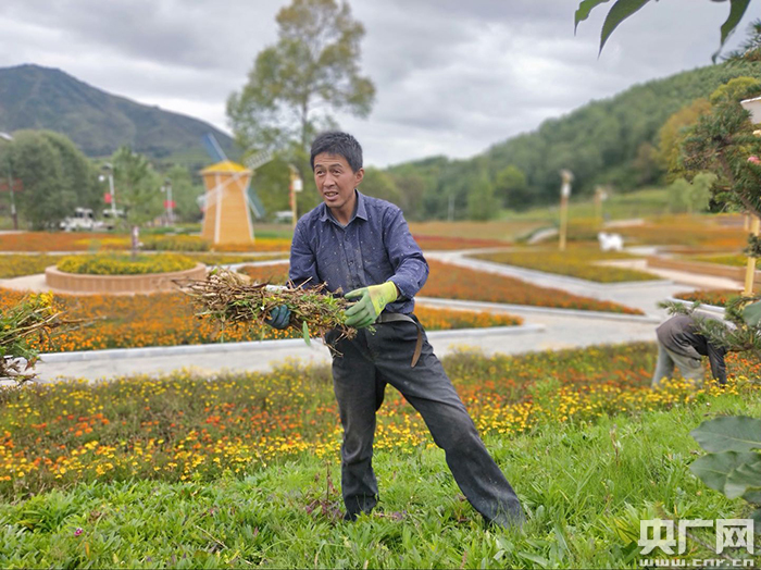 村民正在打理村內(nèi)花草(央廣網(wǎng)記者 王啟慧 攝)