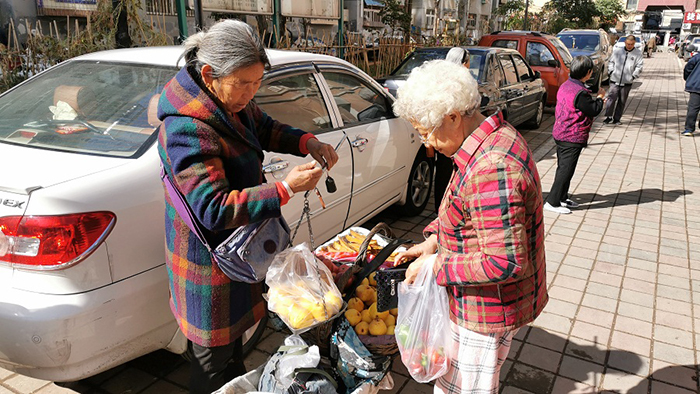 10點整,列車緩緩?吭诔械抡。旅客有序下車后收拾好自己的籮筐,奔向自己熟悉的小區(qū)和集市。張淑琴也來到了她熟悉的小區(qū),認識她的老主顧會定點來購買她家產(chǎn)的無公害、無農(nóng)藥水果。晌午過后,張淑琴的幾十斤蘋果和紅薯干就售賣一空。