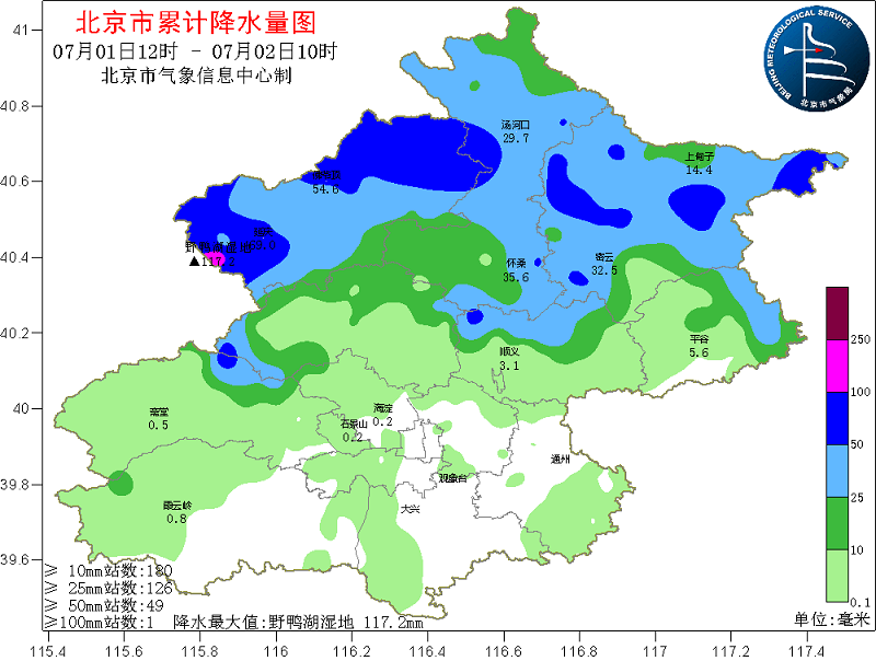 自7月1日中午到夜間,北京已出現(xiàn)分散性雷陣雨,降雨主要集中在北部地區(qū)。其中,延慶、懷柔、密云局地出現(xiàn)暴雨;平谷、順義、密云、懷柔、昌平局地出現(xiàn)冰雹,最大直徑2厘米;密云、懷柔、平谷、通州局地出現(xiàn)6級以上短時大風。北京氣象臺監(jiān)測顯示,7月1日12時至2日10時北京全市平均降雨量13.6毫米,城區(qū)平均0.6毫米,西北部34.8毫米,東北部25.3毫米,西南部3.9毫米,東南部0.2毫米;最大降雨出現(xiàn)在延慶野鴨湖濕地,為117.2毫米,最大小時雨強出現(xiàn)在門頭溝房良村,降雨量為44.8毫米。