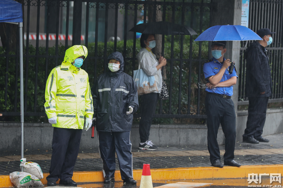 7月9日,北京廣渠門中學(xué)考點(diǎn),工作人員冒雨維持考場周邊秩序(央廣網(wǎng)記者 韓靖 攝)