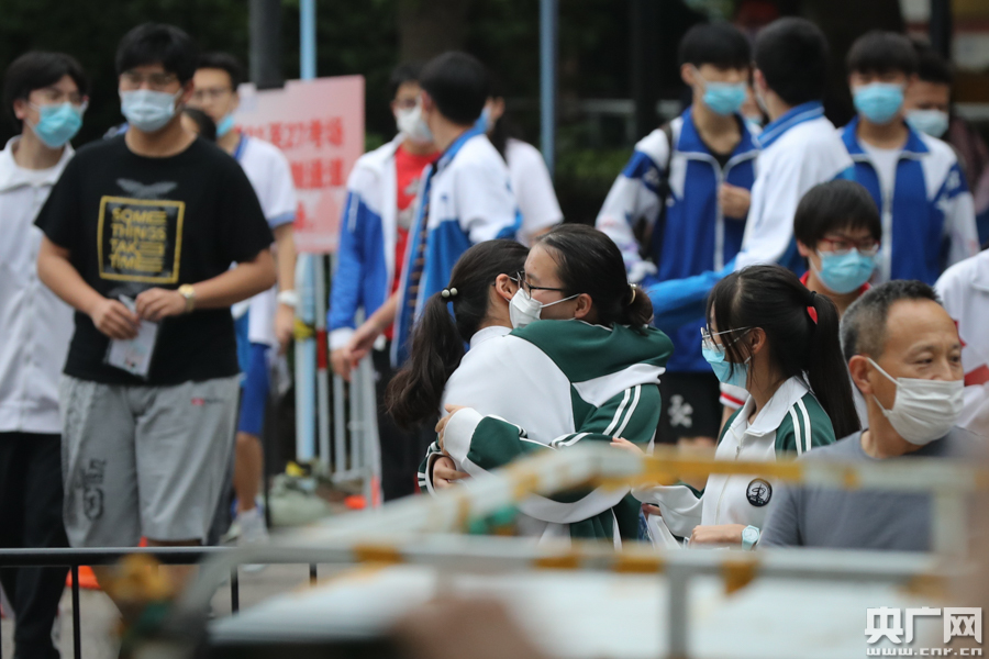7月10日,北京中關村中學考點,兩名考生走出考場后擁抱(央廣網(wǎng)記者 韓靖 攝)