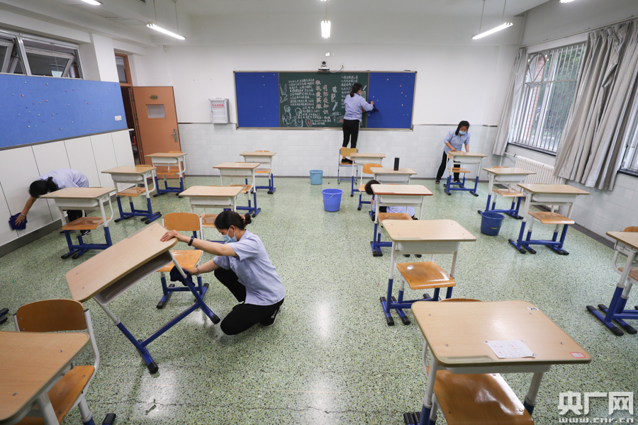7月3日,北京十二中工作人員正在對考場進行保潔和消毒(央廣網(wǎng)記者 韓靖 攝)