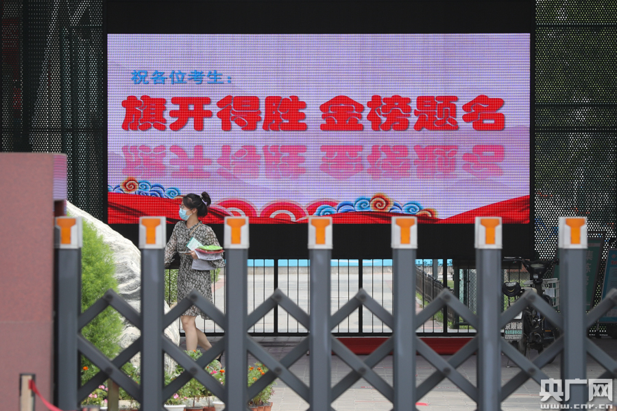 7月4日,北京市通州區(qū)運河中學考點,校內(nèi)電子屏幕上打出對考生的祝福語(央廣網(wǎng)記者 韓靖 攝)