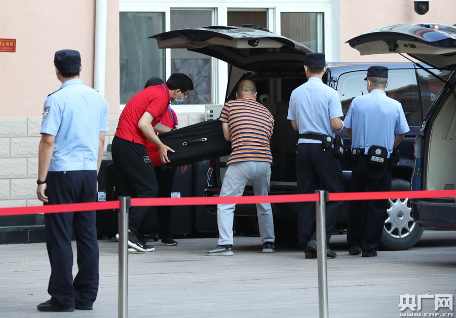 7月7日5時40分,北京市海淀區(qū)招生教育和考試中心,各考點校工作人員乘坐專用車輛前來領取考卷(央廣網(wǎng)記者 韓靖 攝)