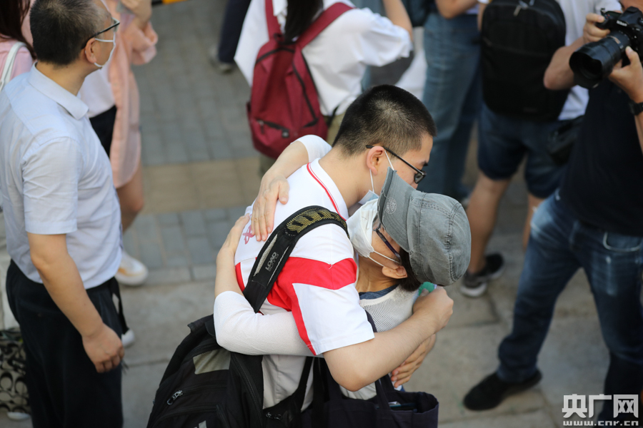 7月7日,中國人民大學附屬中學考點,一名考生進入考場前與家長擁抱(央廣網(wǎng)記者 韓靖 攝)