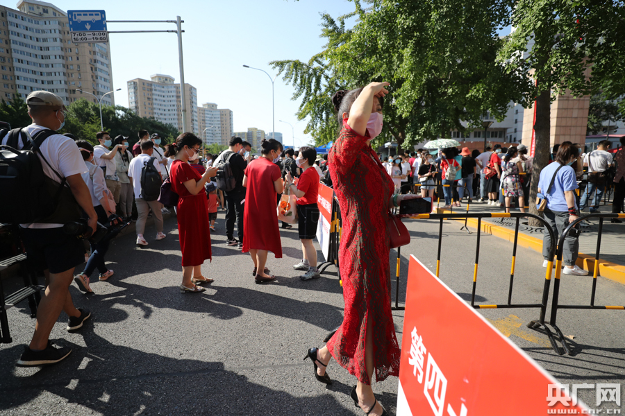 7月7日,中國人民大學附屬中學考點,身穿旗袍的家長前來送考(央廣網(wǎng)記者 韓靖 攝)