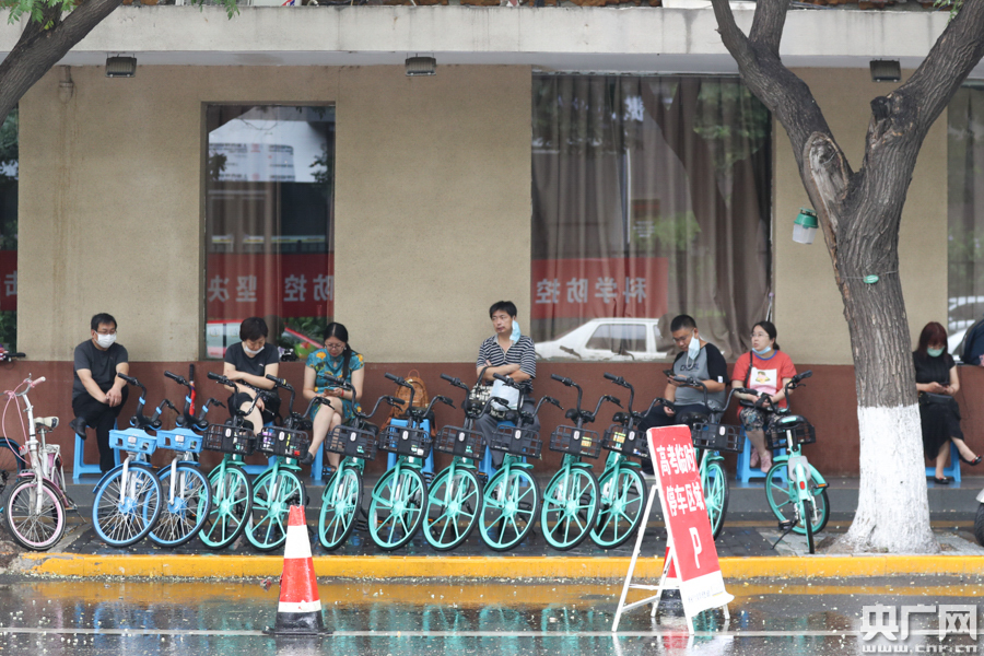 7月9日,北京廣渠門中學考點,前來送考生的家長在路邊避雨(央廣網(wǎng)記者 韓靖 攝)
