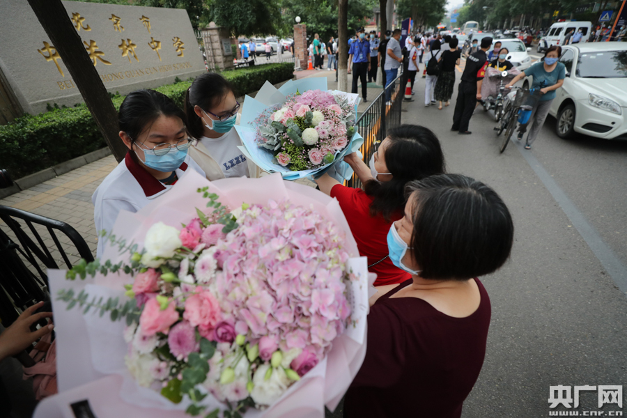 7月10日,北京中關村中學考點,高考結束后兩位家長向考生獻花(央廣網(wǎng)記者 韓靖 攝)