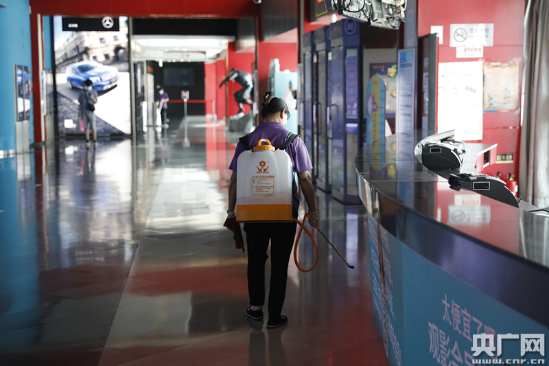 圖為工作人員對影院走廊進行消殺(央廣網記者 張凱航 攝)