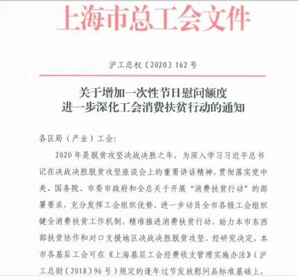 2020年9月9日,上海市總工會(huì)下發(fā)《關(guān)于增加一次性節(jié)日慰問額度進(jìn)一步深化工會(huì)消費(fèi)扶貧行動(dòng)的通知》(上海市總工會(huì)官網(wǎng)截圖)