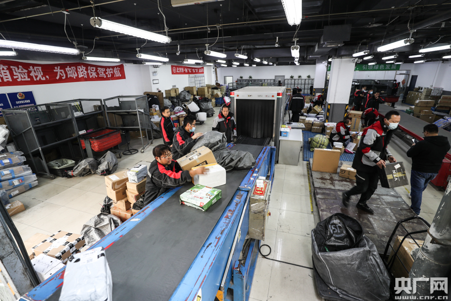 在北京順豐中關(guān)村一網(wǎng)點(diǎn)內(nèi)快遞員正在處理包裹(央廣網(wǎng)記者 韓靖 攝)