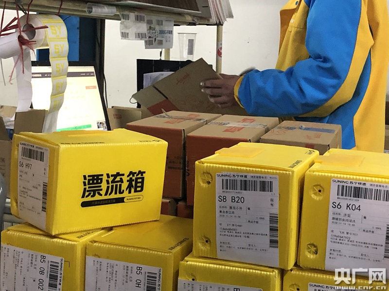 11月11日,蘇寧通州物流基地,這種料箱可代替紙箱裝載消費(fèi)者購(gòu)買的商品,滿足快遞綠色化的要求(央廣網(wǎng)記者 黃一博 攝)