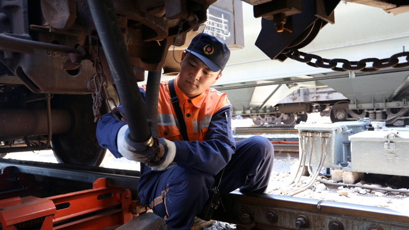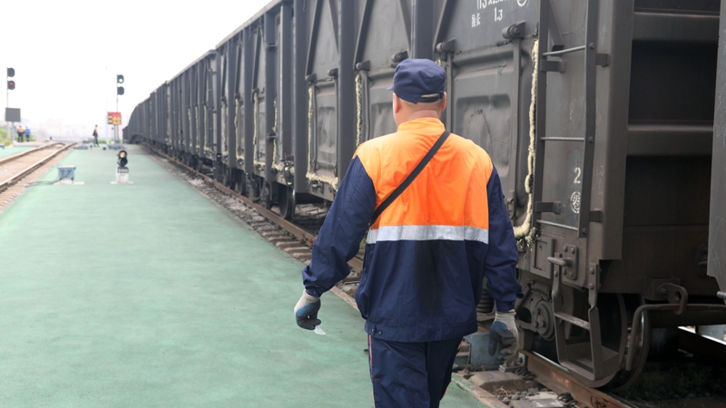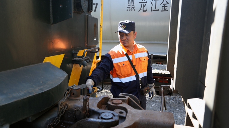 作為中國鐵路沈陽局集團(tuán)有限公司管內(nèi)的編組站,金州站地處沈大鐵路、丹大快速鐵路和金窯、金城專用鐵路4條鐵路線交會(huì)處,站場(chǎng)由客場(chǎng)和運(yùn)轉(zhuǎn)場(chǎng)兩部分組成,主要承擔(dān)4條鐵路線的列車到發(fā)和解編作業(yè)。今年45歲的調(diào)車長宋倫政,已經(jīng)在調(diào)車場(chǎng)上工作了十多個(gè)年頭。10時(shí)10分,調(diào)車組接到1調(diào)車組第4次調(diào)車作業(yè)計(jì)劃后,在1場(chǎng)7道掛46輛車,宋倫政帶領(lǐng)“鉤子手”從南走到北,對(duì)?康囊涣胸涍\(yùn)列車逐一進(jìn)行“勾、管、閘”檢查。