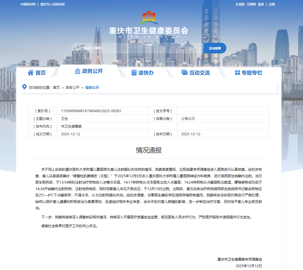 經(jīng)初步核查,患兒馬某某因確診“脊髓性肌萎縮癥(Ⅱ型)”于2025年12月9日收入重慶醫(yī)科大學(xué)附屬兒童醫(yī)院神經(jīng)內(nèi)科病房,進(jìn)行諾西那生鈉鞘內(nèi)注射。當(dāng)日醫(yī)生取藥后,于13:54將擬注射治療藥物放入冰箱冷凍層,14:17將藥物從冷凍層取出放入冷藏層,14:24將藥物從冷藏層取出復(fù)溫,腰椎穿刺成功后于14:34開始鞘內(nèi)注射藥物,注射完藥物后,同時(shí)觀察患兒未見不良反應(yīng),于12月10日出院。