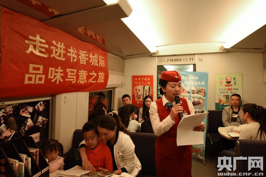 武漢客運(yùn)段:列車書(shū)香分享行進(jìn)之美 央廣網(wǎng)武漢4月25日消息(記者張毛清 通訊員易娜 蘇杭)近日,武漢鐵路局武漢客運(yùn)段在流動(dòng)的類車上開(kāi)展了“走進(jìn)書(shū)香城際 品味寫(xiě)意之旅”為主題的讀書(shū)活動(dòng)。武漢客運(yùn)段負(fù)責(zé)人表示,在流動(dòng)的車廂里與廣大旅客分享閱讀之美的讀書(shū)活動(dòng)將會(huì)常態(tài)化、規(guī);