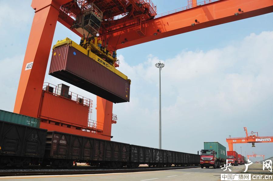 大連鐵路集裝箱中心站為沈大雙向客車化集裝箱班列裝載發(fā)往沈陽的進口集裝箱(央廣網(wǎng)發(fā) 于海青攝)