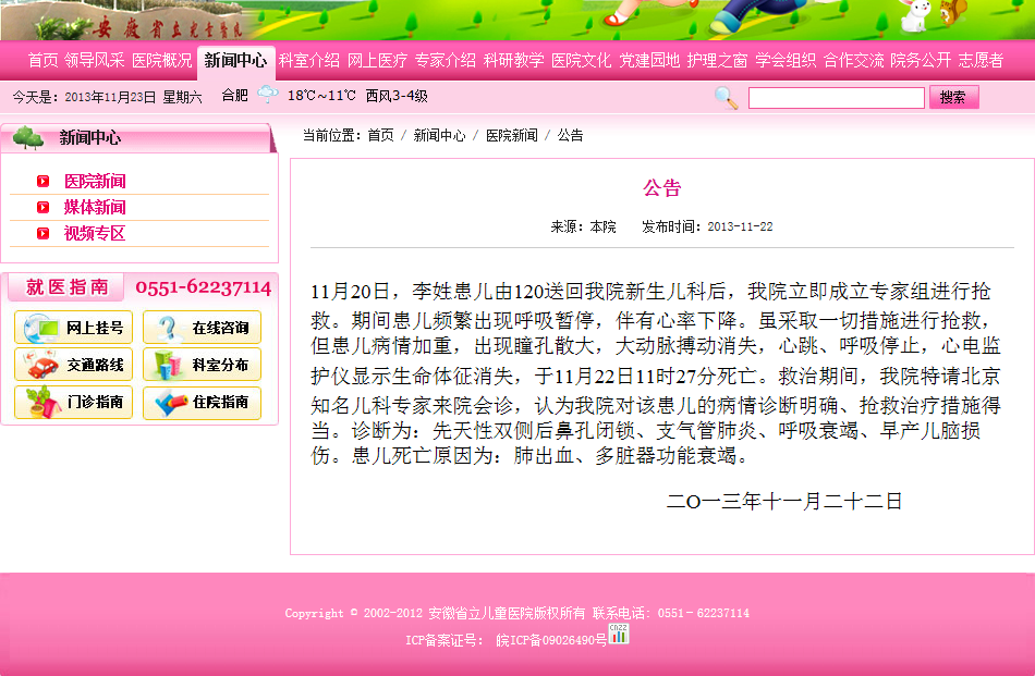 11月20日,李姓患兒由120送回我院新生兒科后,我院立即成立專家組進(jìn)行搶救。期間患兒頻繁出現(xiàn)呼吸暫停,伴有心率下降。雖采取一切措施進(jìn)行搶救,但患兒病情加重,出現(xiàn)瞳孔散大,大動(dòng)脈搏動(dòng)消失,心跳、呼吸停止,心電監(jiān)護(hù)儀顯示生命體征消失,于11月22日11時(shí)27分死亡。救治期間,我院特請(qǐng)北京知名兒科專家來院會(huì)診,認(rèn)為我院對(duì)該患兒的病情診斷明確、搶救治療措施得當(dāng)。診斷為:先天性雙側(cè)后鼻孔閉鎖、支氣管肺炎、呼吸衰竭、早產(chǎn)兒腦損傷;純核劳鲈?yàn)椋悍纬鲅、多臟器功能衰竭。