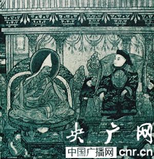 1652年,五世達賴喇嘛阿旺羅桑嘉措進京朝覲順治皇帝(壁畫)(央廣網(wǎng)記者 德慶白珍 攝)