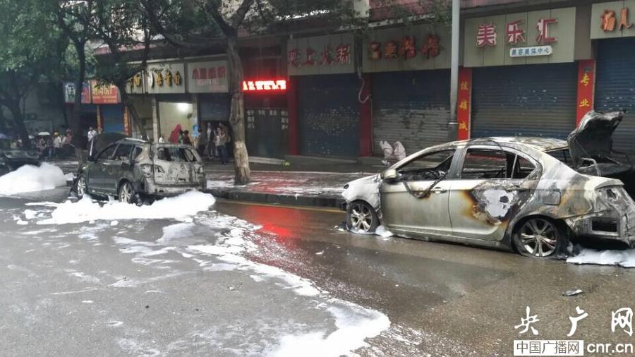 油罐車(chē)附近被爆燃燒毀的汽車(chē)(央廣網(wǎng)記者 陳鵬 攝)