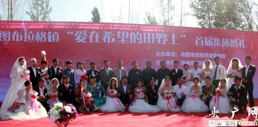 集體婚禮現(xiàn)場,在浪漫音樂的輕奏下,鮮艷的國旗被藍(lán)天勾勒出美麗的輪廓,維、蒙、漢、哈、回5個(gè)民族12對新人和2對金婚夫婦手拉手在國旗下宣誓,放飛和平鴿,攜手倡導(dǎo)文明,守護(hù)和諧家園,祝福祖國安定和諧,F(xiàn)場還表演了《博爾塔拉我的愛》大型集體舞和傳統(tǒng)麥西萊甫舞蹈,婚宴則是用新疆民族風(fēng)味的大鍋?zhàn)ワ執(zhí)娲,充分體現(xiàn)了節(jié)儉辦婚禮。