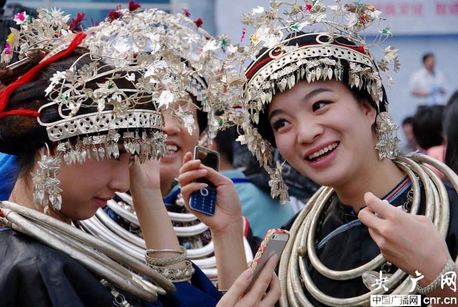 貴州凱里苗族群眾載歌載舞慶祝2014中國(guó)國(guó)際民間工藝品博覽會(huì)暨第三屆中國(guó)銀飾刺繡博覽會(huì)開(kāi)幕(央廣網(wǎng)發(fā) 姜澤鵬 攝)