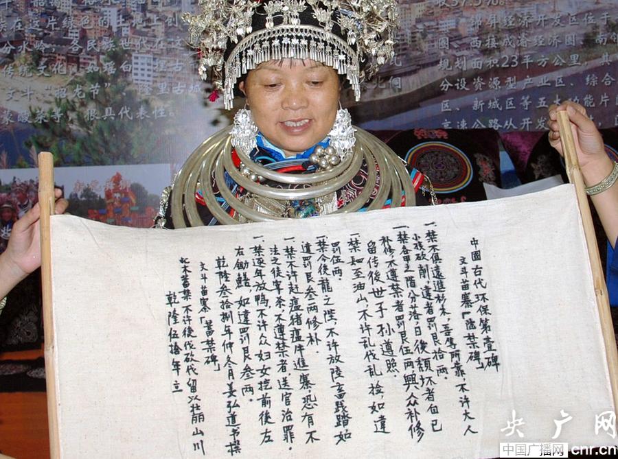 貴州省錦屏縣加池村苗族婦女展示該村清代林業(yè)契約文書。(央廣網(wǎng)發(fā) 姜澤鵬 攝)