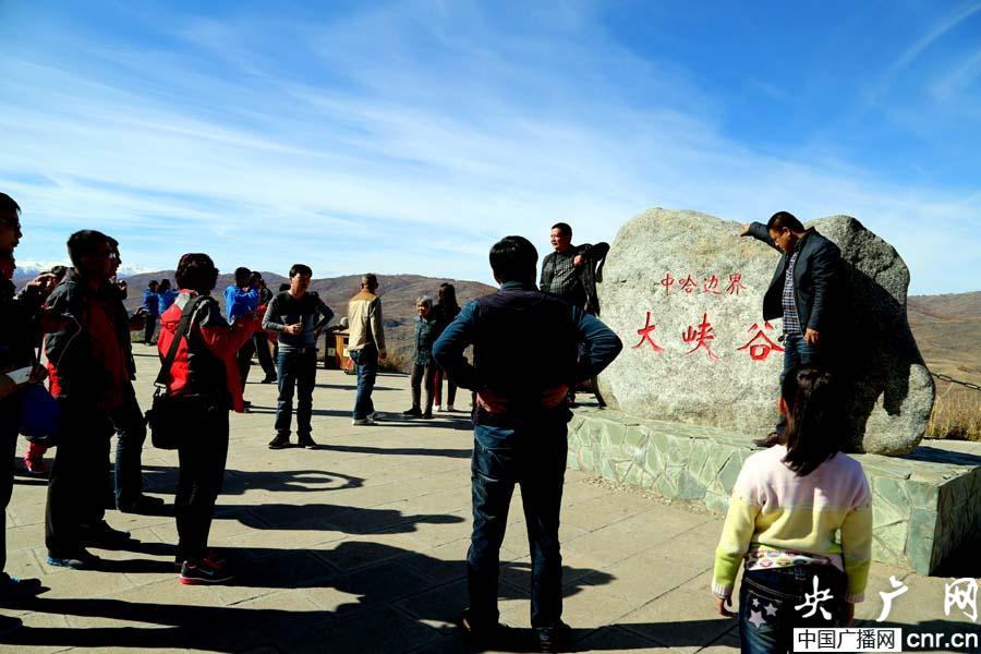 游客爭相在白哈巴景區(qū)中哈邊界大峽谷留影(央廣網記者 張雷 攝)