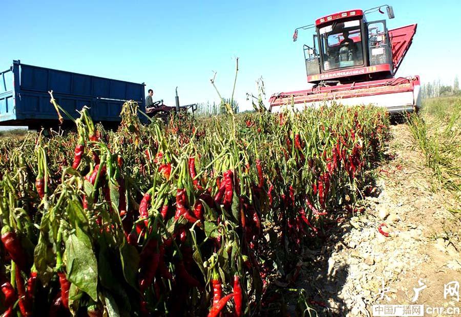 新疆焉耆縣萬(wàn)畝辣椒機(jī)械采收(阿里木江·毛拉肉孜攝)