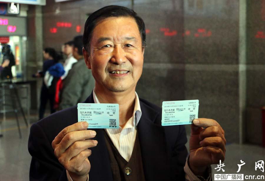 上午11點(diǎn)整,68歲的烏魯木齊市民張長(zhǎng)齡老人在烏魯木齊南站售票窗口買(mǎi)到了11月16日首發(fā)列車(chē)的第一張票。
