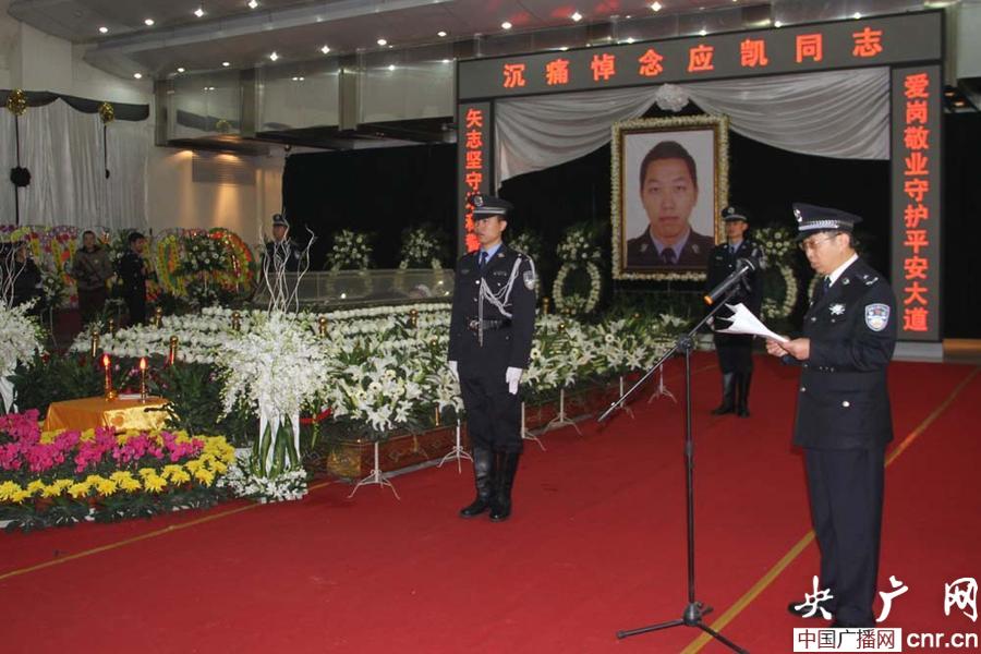 遺體告別儀式上,成都市公安局領(lǐng)導(dǎo)介紹應(yīng)凱同志生平(央廣網(wǎng)記者 賈宜超 攝)